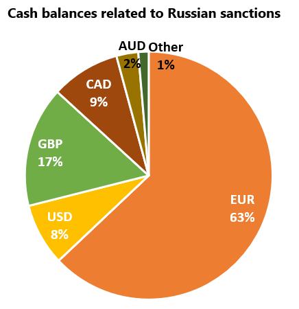 To model the income from investing the assets into bonds, we apply the end-2021 currency shares implied by the CBR’s end-2021 disclosure to both the identified €260 billion and the potential €324 billion.